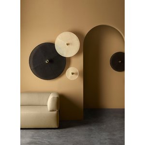 - beschikt over een rotan webbing disc voorzien van 8-kantige gaatjes. Deze disc is leverbaar in drie verschillende groottes: Ø 30 cm, Ø 60 cm of Ø 90 cm én in twee verschillende kleuren: naturel of zwart. Elke disc wordt apart verkocht. Op de afbeelding is een samenstelling van 3 stuks te zien. Het is leuk om diverse maten en kleuren met elkaar te combineren.