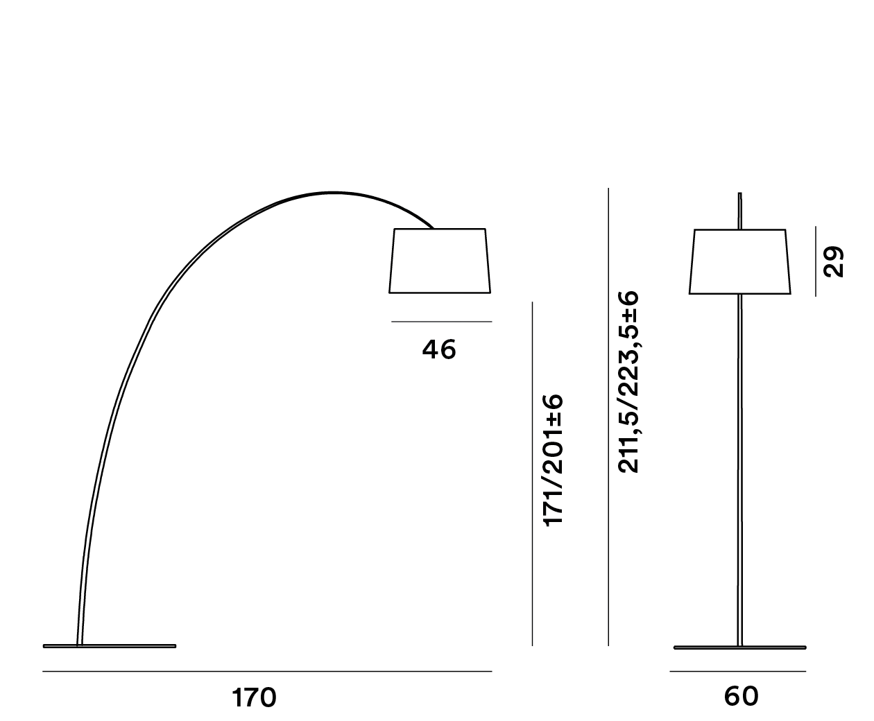 | Afmetingen: | Totaal L 170 cm x B 60 cm Lampenkap Ø 46 cm x H 29 cm Snoer L 180 cm + 150 cm |