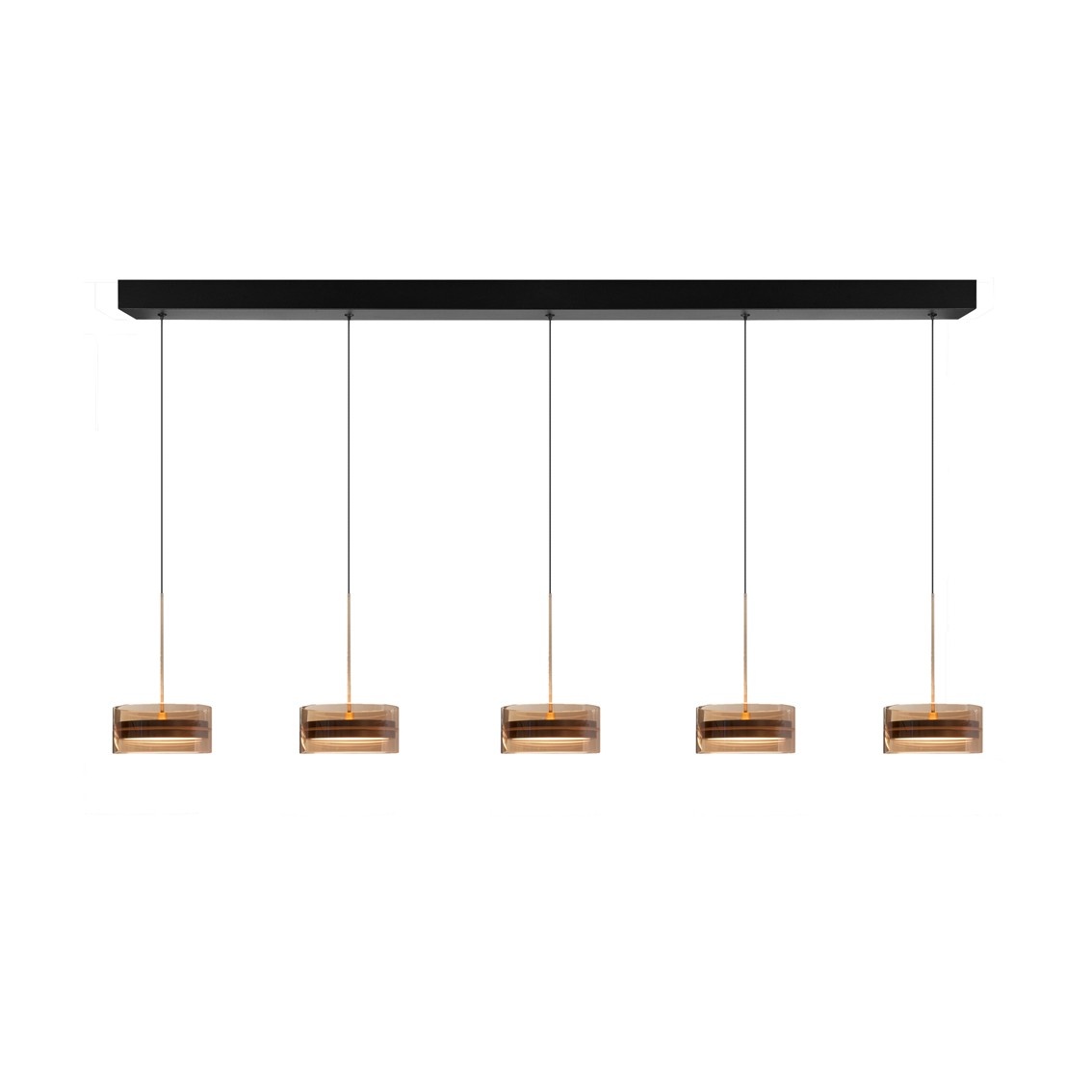 - combineert amberkleurig glas, zwart metaal en bronzen accenten.