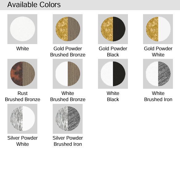 | Leverbaar in de kleur(en): | wit goud/geborsteld brons goud/zwart goud/wit roestbruin/geborsteld brons wit/geborsteld brons wit/zwart wit/geborsteld ijzer zilver/wit zilver/geborsteld ijzer |
