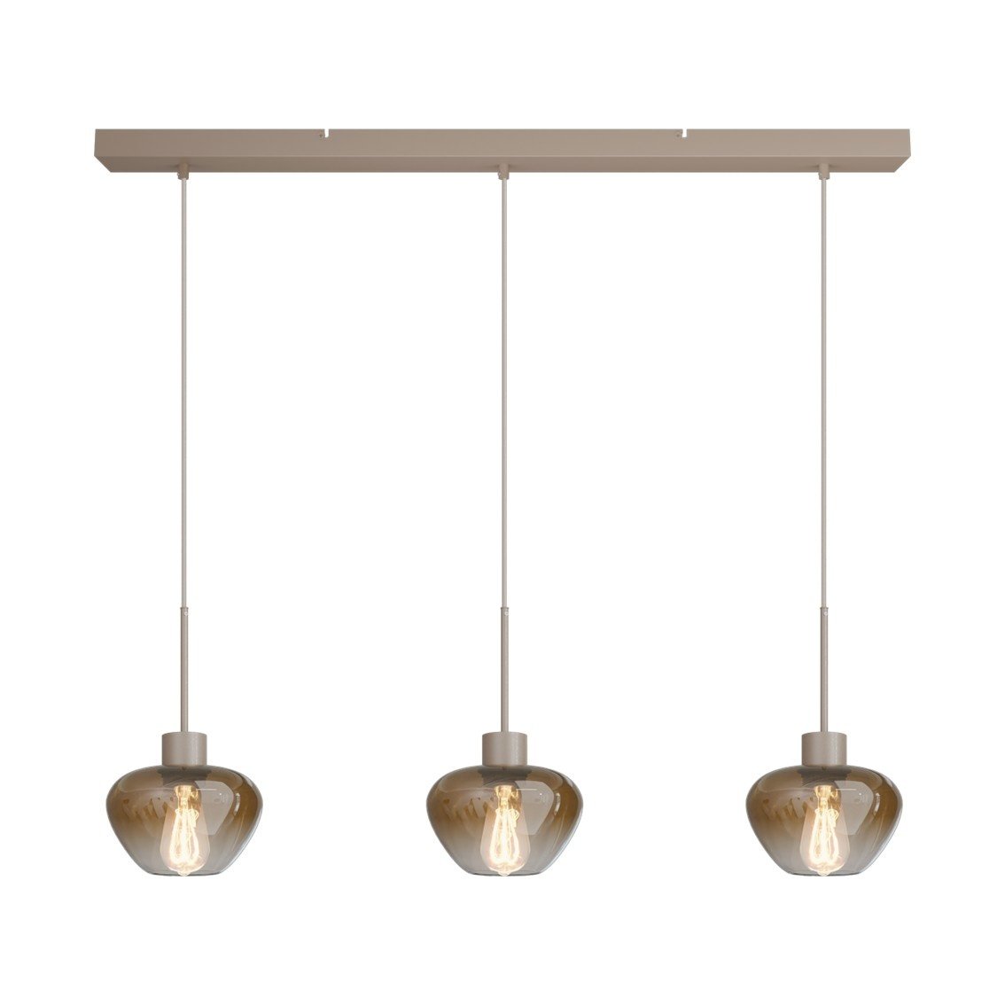 • is voorzien van drie luxe, mond geblazen glazen kappen in een warme tint. Deze worden gecombineerd met verfijnde metalen details in de kleuren: beige, cacaobruin of zwart.
