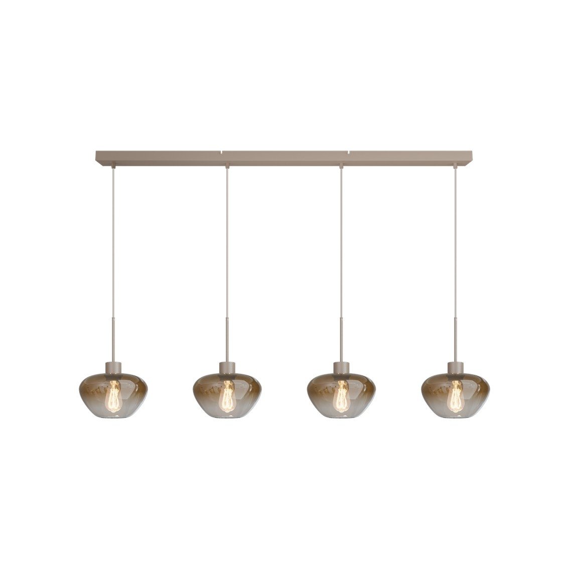 - is voorzien van vier luxe, mond geblazen glazen kappen in een warme tint. Deze worden gecombineerd met verfijnde metalen details in de kleuren: cacaobruin, zwart of beige.