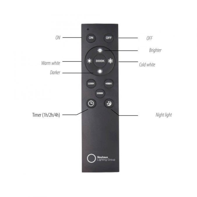 | Afstandsbediening: | wordt meegeleverd en heeft de volgende functies: 1. aan én uitschakelen 2. instellen van de helderheid (100% tot 10%) 3. instellen van de lichtkleur (2200 K ⇔ 5000 K) 4. Timer 5. Nachtlicht |