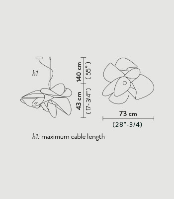 | Afmetingen: | Lampenkap: L 73 cm x B 73 cm x H 43 cm Snoer: L min. 20 cm - max. 140 cm Plafondafdekking: Ø 14 cm x H 3,2 cm |